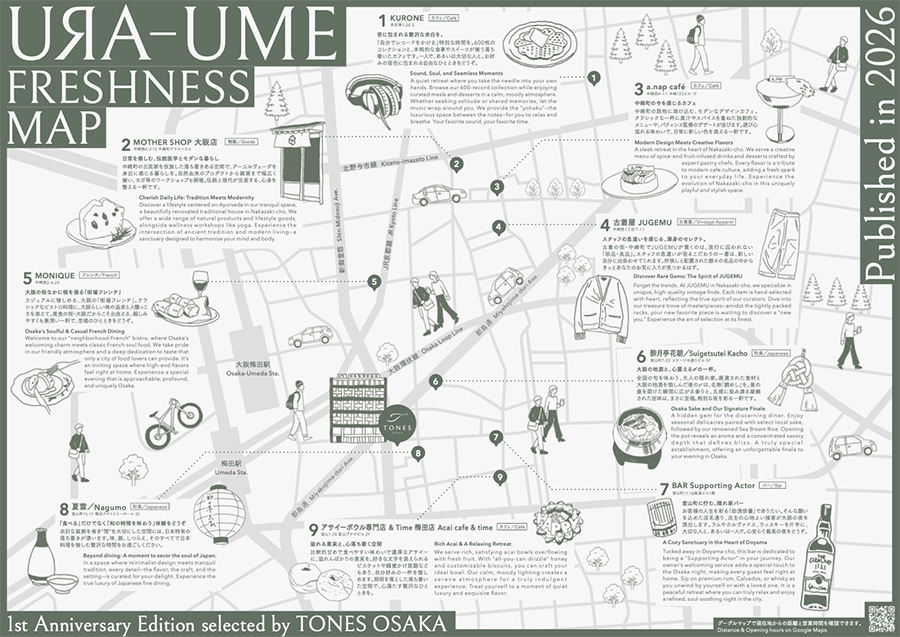 第一弾のテーマは“Freshness”。TONES OSAKAの開業と同時期、またはこの1年前後 にオープンした新しい飲食店やショップなど、これからの東梅田をつくっていく10店舗を ピックアップしました。<掲載店舗>KURONE / MOTHER SHOP 大阪店 / a.nap café / 古着屋JUGEMU 大阪 中崎町 / MONIQUE /酔月亭花朝 / BAR Supporting Actor / 夏雲 / アサイーボウル専門店 & Time / Dessert & Bar ONSE私たちは、宿泊とは“滞在すること”ではなく、都市のリズムに触れるプロセスだと考えています。 TONES OSAKAは、ホテルを目的地ではなく、街に混ざるための起点として設計してきました。 URA-UMEはその思想を形にしたプロジェクトであり、観光とは異なる都市体験の可能性を 提示する試みです。 是非お手にとってURA-UMEをお楽しみください。