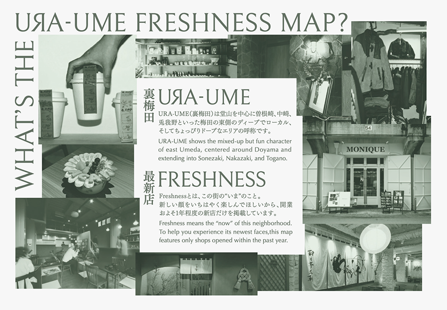 観光地巡りを目的としたガイドではなく、街の日常に自然に混ざる体験を促すことを 目的としたものです。路地の店舗、ローカルに根付いた店、偶然の発見を楽しむ場所 など、東梅田の新しい街の温度を可視化しました。